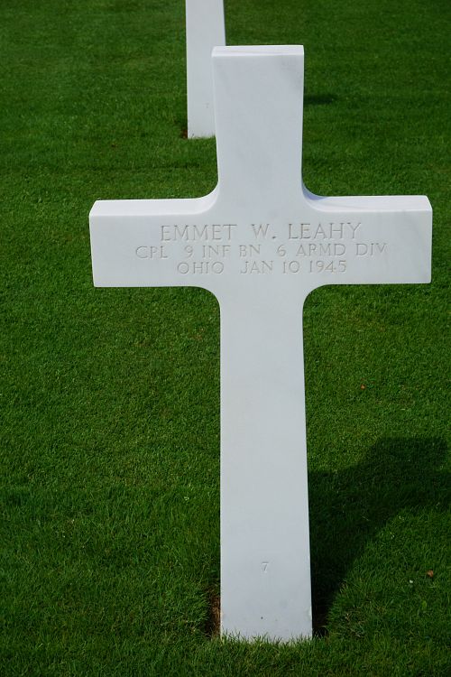 Cpl Emmet W. Leahy graduated from McKinley High School and was a crane man before he enlisted in Akron, Ohio on 12 April 1943.He was first buried at the Temporary American Military Cemetery in Grand Failly, France.