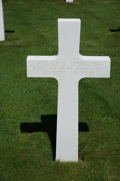S/Sgt William E. Leidecker attended high school for one year and worked on a farm before he enlisted in Evansville, Indiana on 10 April 1943.Source of information: Peter Schouteten, www.abmc.gov, www.wwiimemorial.com, www.archives.gov – WWII Enlistment Record, www.ancestry.com - Headstone and Interment Record / Leaidicker Family Tree, www.findagrave.com