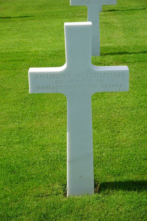 Pfc Anthony A. Louzonis worked in a factory before he enlisted at Fort Devens, Massachusetts on 14 March 1944.Source of information: Leo Minne, www.abmc.gov, www.wwiimemorial.com, www.archives.gov – WWII Enlistment Record, www.ancestry.com - U.S. Headstone and Interment Record for U.S. Military Cemeteries on Foreign Soil 1942-1949, A footsoldier for Patton / Michael C. Bilder James G. Bilder, The 5th Infantry Division in the ETO