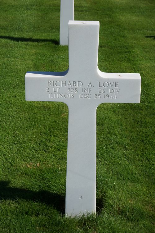 2nd Lt Richard A. Love attended high school for four years and was a clerk at the National Tea Company before he enlisted in Chicago, Illinois on 17 September 1941.He was first buried at the Temporary American Military Cemetery in Grand-Failly, France.