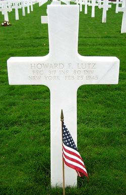Pfc Howard F. Lutz attended high school for four years and was a production foreman before he enlisted in New York City, New York, on 31 August 1943.Pfc Lutz was awarded the Bronze Star for heroic achievement in Luxembourg on 26 January 1945. The citations read in part: "At Pintsch, Luxembourg, Pfc Lutz volunteered to replenish his company's supply of ammunition. Despite sever hostile fire he manned a machine gun mounted on a truck loaded with ammunition while the driver traveled over mined roads and through enemy barrages."