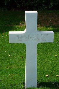 Pvt William E. MacAroff enlisted in New York City on 29 April 1943.Source of information: Leo Minne, www.abmc.gov, www.wwiimemorial.com, www.ancestry.com - Headstone and Interment Record / 1930 Census / New York Birth Index, www.indianamilitary.org/106ID/SoThinkMenu/SoThinkTOC106th.htm