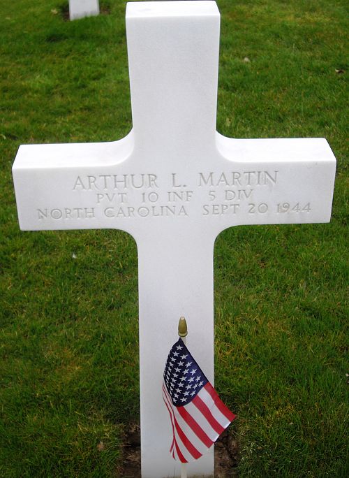 Pvt Arthur L. Martin enlisted at Camp Croft, South Carolina on 25 January 1944.Source of information: Leo Minne, www.abmc.gov, www.wwiimemorial.com, www.archives.gov – WWII Enlistment Record, www.ancestry.com – 1930/1940 Census / Headstone and Interment Record 1942-1949, www.findagrave.com, A footsoldier for Patton / Michael C. Bilder James G. Bilder, The 5th Infantry Division in the ETO