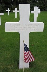 Pfc Charlie J. Matthews attended high school for one year and was a filling station attendant when he joined the National Guard in Kingstree, South Carolina on 27 January 1941.He was severely wounded in action by blast injuries in the buttock and hip, caused by a landmine.