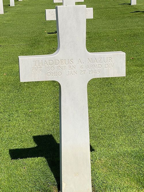 Pvt Thaddeus A. Mazur attended high school for four years before he enlisted in Cleveland, Ohio on 4 April 1942.He was first buried at the Temporary American Military Cemetery in Grand Failly, France.