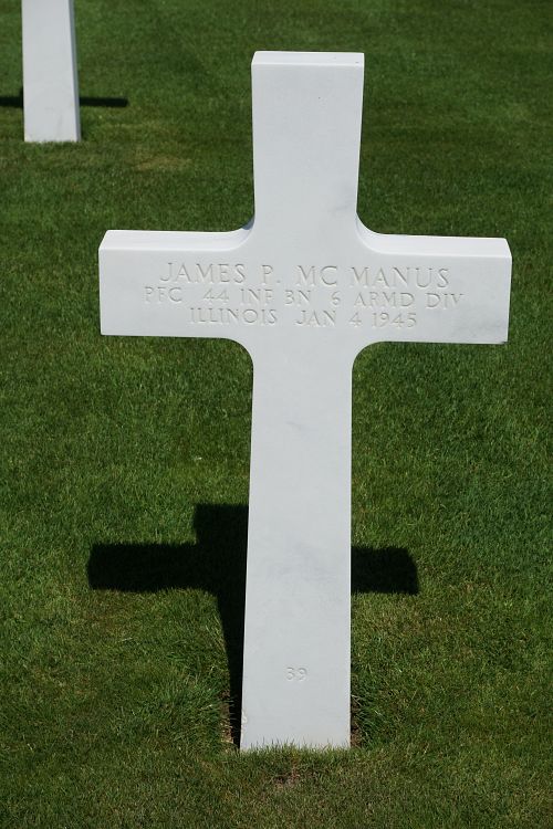 Pfc James P. McManus was employed at the Chicago Surface Lines before he enlisted.Source of information: Peter Schouteten, www.abmc.gov, www.wwiimemorial.com, www.ancestry.com - Headstone and Interment Record / 1920 Census / U.S. WWII Draft Cards Young Men, www.super6th.org