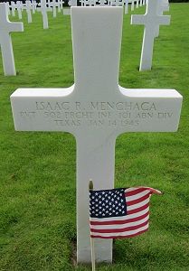 Pvt Isaac R. Menchaca was first buried at the Temporary American Military Cemetery of Grand Failly, France.Source of information: Peter Schouteten, www.abmc.gov, www.wwiimemorial.com, www.ancestry.com - Headstone and Interment Record / 1940 Census / U.S., Social Security Applications and Claims Index, http://www.ww2-airborne.us