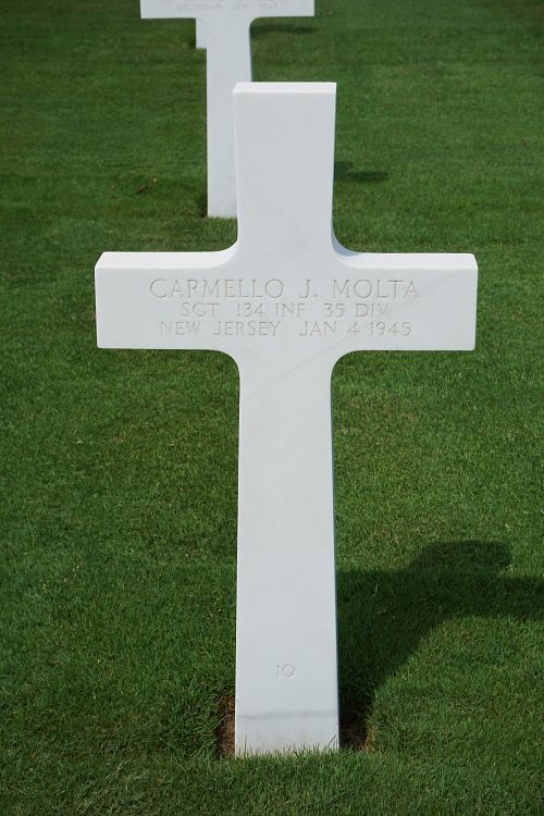 Sgt Carmello J. Molta attended one year of high school and was an architect before he enlisted in Newark, New Jersey on 26 November 1940.Source of information: Peter Schouteten, www.abmc.gov, www.wwiimemorial.com, www.archives.gov - WWII Enlistment Record, www.ancestry.com - Headstone and Interment Record / U.S. WWII Draft Cards Young Men / 1920/1930 Census, After Action Report 35th Infantry Division