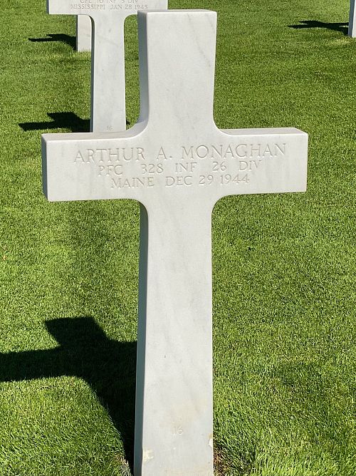 Pfc Arthur A. Monaghan was a driver before he enlisted at Fort Devens, Massachusetts on 8 May 1944.He was killed by artillery shell fragments to the back.