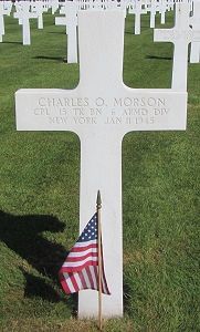 Cpl Charles O. Morson was employed at the London Terrace Food Company before he enlisted.Source of information: Peter Schouteten, www.abmc.gov, www.wwiimemorial.com, www.ancestry.com - Headstone and Interment Record / Jackson & Reed Family Tree / New York State Birth Index / U.S. WWII Jewish Servicemen Cards / U.S. WWII Draft Cards Young Men, www.6tharmoreddivision.com, www.super6th.org