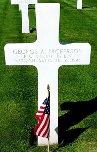 Pfc George A. Nickerson attended high school for four years and was a draftsman at the Service Caster and Truck Company before he enlisted in Boston, Massachusetts on 20 April 1944.Source of information: Peter Schouteten, www.abmc.gov, www.wwiimemorial.com, www.archives.gov - WWII Enlistment Record, www.ancestry.com - Headstone and Interment Record / U.S. WWII Draft Cards Young Men / Ballard Norton Family Tree, http://87thinfantrydivision.com