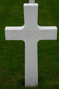Capt Monson was taken prisoner during the Battle of the Bulge. While being transported by the Germans, the POW column was strafed by American fighters wounding and killing many prisoners, including Monson.