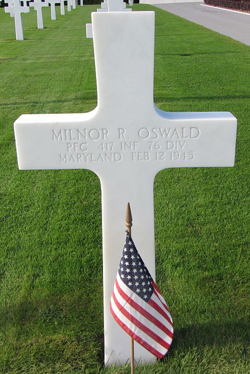 Pfc Milnor R. Oswald graduated from Allegany High School. He was a talented athletic. After graduation, Oswald worked as an office clerk.He enlisted at Fort George G. Meade, Maryland, on 29 April 1944 and received his basic training at Camp Croft, South Carolina, and Camp McCoy, Wisconsin.