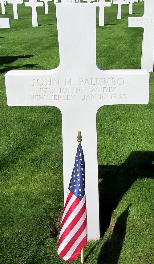 Pfc John M. Palumbo was a driver before he enlisted in Trenton, New Jersey on 19 January 1941.Source of information: Peter Schouteten, www.abmc.gov, www.wwiimemorial.com - Susan F. Clements, www.archives.gov – WWII Enlistment Record, www.ancestry.com - Headstone and Interment Record / U.S. WWII Draft Cards Young Men / Theresa Natalizio Family Tree, www.fold3.com – 26th Infantry Division
