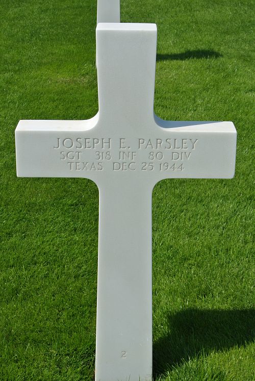 Sgt Joseph E. Parsley graduated from Carrollton High School in 1938 and was employed at Continental Motors.He enlisted at Camp Wolters, Texas on 30 March 1944 and was sent overseas in September 1944.