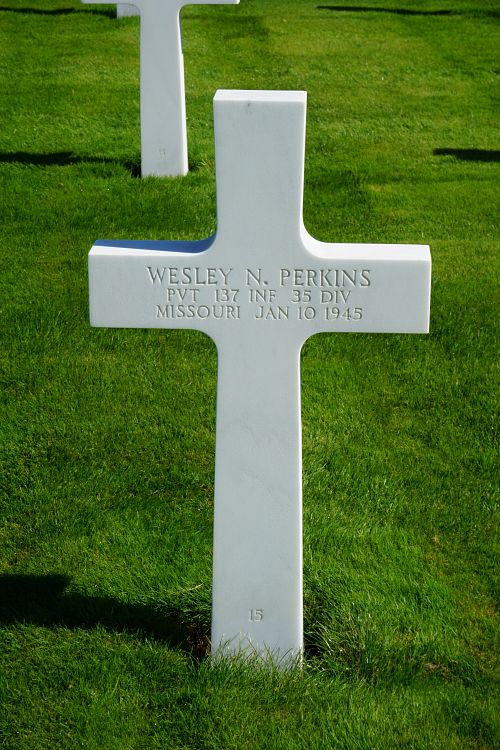 Pvt Wesley N. Perkins graduated from Webster Groves High School in June 1943.He joined the U.S. Army Reserve at Jefferson Barracks, Missouri on 3 June 1944 and arrived in France on 10 December 1944.