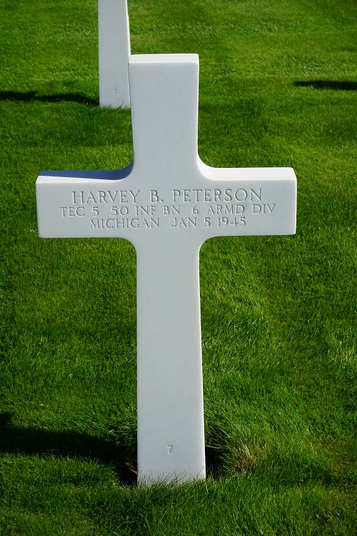 T/5 Harvey B. Peterson was employed by the Ford Motor Company before he enlisted in Marquette, Michigan on 19 March 1942. He was sent overseas in November 1943.He was struck by a fragment of an artillery shell which exploded in the trees directly over the vehicle he was driving. He was instantly killed.