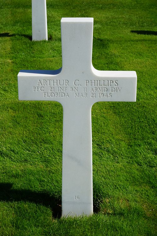 Pfc Arthur C. Phillips enlisted at Camp Blanding, Florida on 18 February 1943.Source of information: André Koch, www.abmc.gov, www.wwiimemorial.com, www.archives.gov – WWII Enlistment Record, www.ancestry.com - Headstone and Interment Record / U.S. WWII Draft Cards Young Men, 1940-1947,