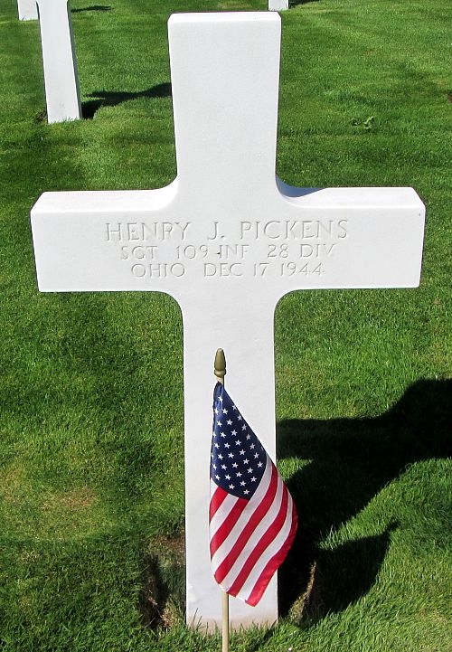 Sgt Henry J. Pickens enlisted at Fort Benjamin Harrison, Indiana on 4 March 1942 and was sent overseas in October 1943.Source of information: Peter Schouteten, Kathy McDermott, www.abmc.gov, www.wwiimemorial.com, www.archives.gov – WWII Enlistment Record, www.ancestry.com - Headstone and Interment Record / 1940 Census, www.findagrave.com