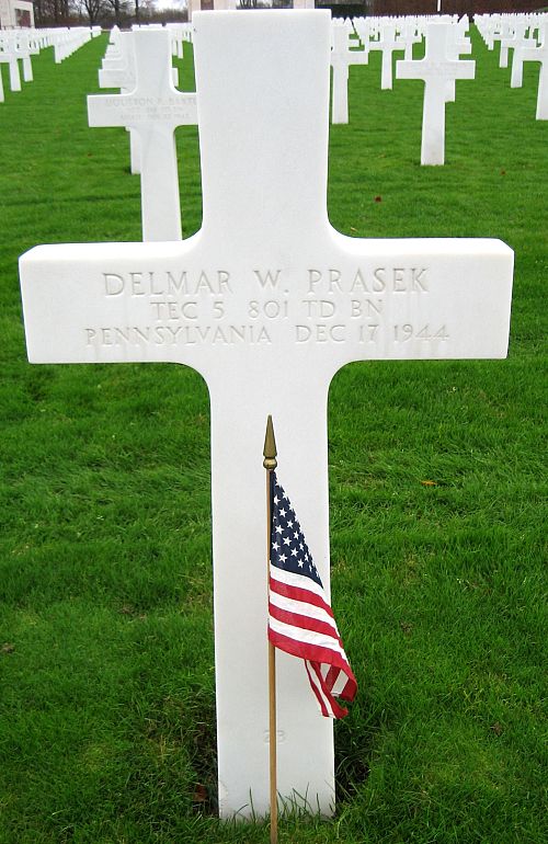 T/5 Delmar W. Prasek enlisted in Pittsburgh, Pennsylvania on 29 December 1942.Source of information: Peter Schouteten, www.abmc.gov, www.wwiimemorial.com, www.archives.gov, www.ancestry.com - Headstone and Interment Record / U.S. WWII Draft Cards Young Men / Pennsylvania Veteran Compensation Application Files WWII / 1940 Census, www.tankdestroyer.net, www.findagrave.com - MAJ Jimmy Cotton