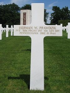 Herman W. Prawdzik was attending Frakford High School when he joined the U.S. Army Reserve in New Cumberland, Pennsylvania on 8 March 1944. He had been overseas since October 1944.He was first buried at the Temporary American Military Cemetery of Grand Failly, France.