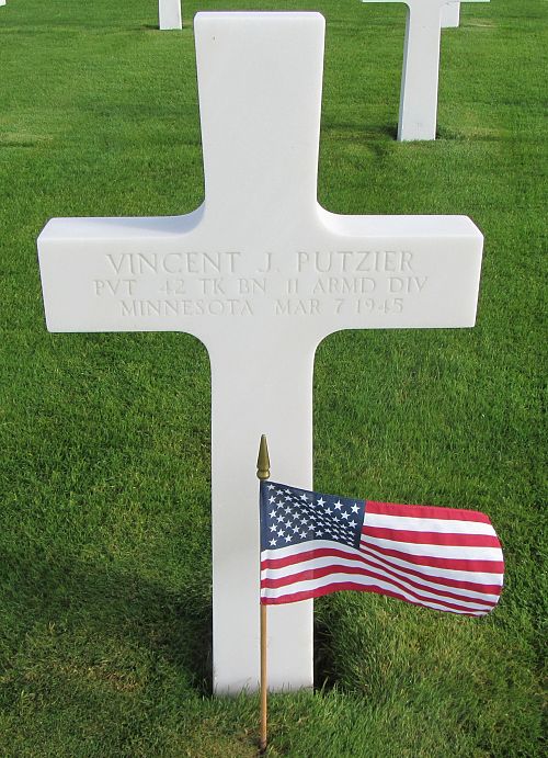 Pvt Vincent J. Putzier enlisted at Fort Snelling, Minnesota on 3 August 1944. He received training at Fort Knox, Kentucky and Fort George G. Meade, Maryland.The cause of death was noted as crushing probably in or under his tank.