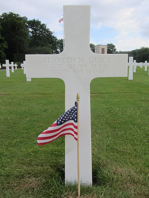S/Sgt Kenneth N. Quick worked on his own farm before he enlisted in Boise, Idaho on 15 November 1943. He was sent overseas in August 1944.He was awarded the Purple Heart Medal a first time for wounds received on 2 December 1944.