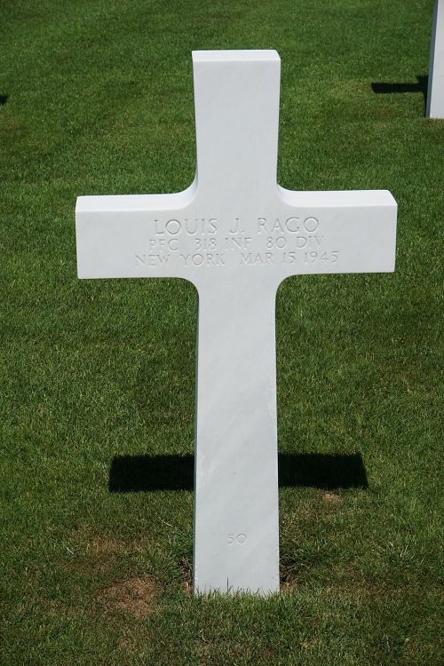 Pfc Louis J. Rago attended high school for two years and was a cook before he enlisted at Fort Jay, New York on 18 June 1942.He was killed by artillery shell fragments in the thorax.