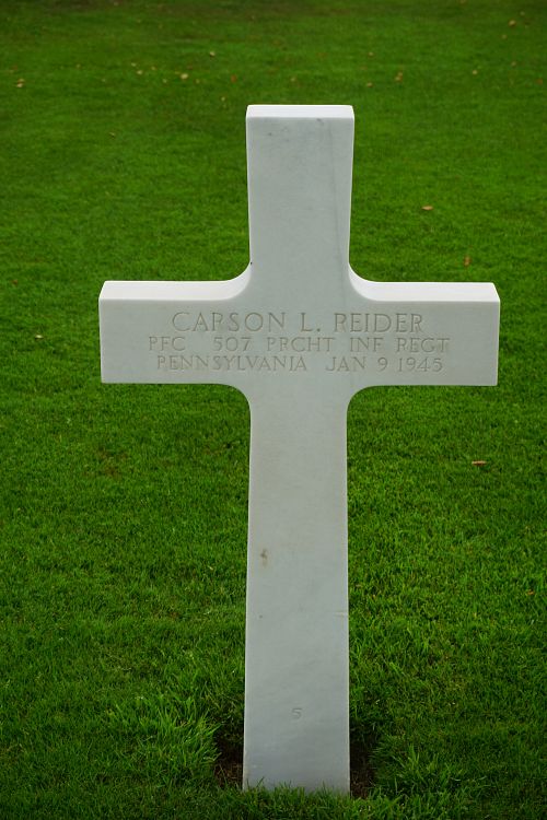 Pfc Carson Reider was a weaver before he enlisted in Harrisburg, Pennsylvania on 18 January 1943.He died of wounds, sustained by artillery shell fragments in his skull.