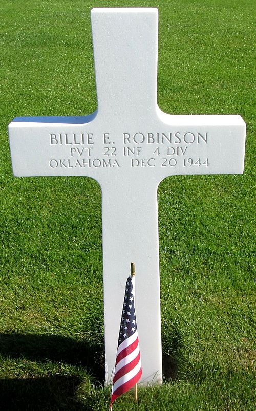 Pvt Billie E. Robinson worked on a farm before he enlisted at Fort Sill, Oklahoma on 24 May 1944.Source of information: Peter Schouteten, Danny van der Groen – Company’s / 4ID After Action Reports, www.abmc.gov, www.wwiimemorial.com, www.archives.gov – WWII Enlistment Record, www.ancestry.com - U.S. Social Security Applications and Claims Index