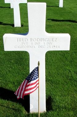 Pvt Fred Rodriguez attended the Fallbrook Union High School for four years. After graduating in 1940 at the age of 18, he had had been working at Consolidated Aircraft plant 2 in San Diego, California. He enlisted at Fort McArthur, San Pedro, California on 3 June 1944.He was a Native American and had lived in the Rincon Reservation before he enlisted.