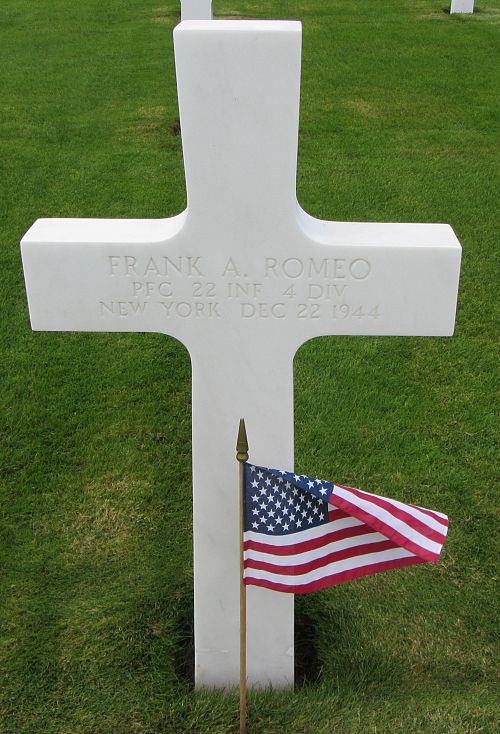Pfc Frank A. Romeo enlisted in Jamaica, New York on 28 February 1941.Source of information: Peter Schouteten, Danny van der Groen – Company’s / 4ID After Action Reports, www.abmc.gov, www.wwiimemorial.com, www.archives.gov – WWII Enlistment Record, www.ancestry.com - Headstone and Interment Record / LaMonica Family Tree