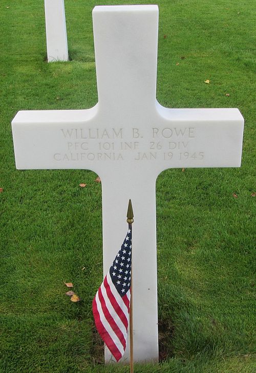 Pfc William B. Rowe attended Kelly's Bridge School before he enlisted at Fort MacArthur, California on 24 April 1944. He was sent overseas in October 1944.Source of information: Peter Schouteten, www.abmc.gov, www.wwiimemorial.com, www.archives.gov - WWII Enlistment Record, www.ancestry.com - Headstone and Interment Record / Lannie Rowe Family Tree, www.findagrave.com, www.fold3.com - 26th Infantry Division