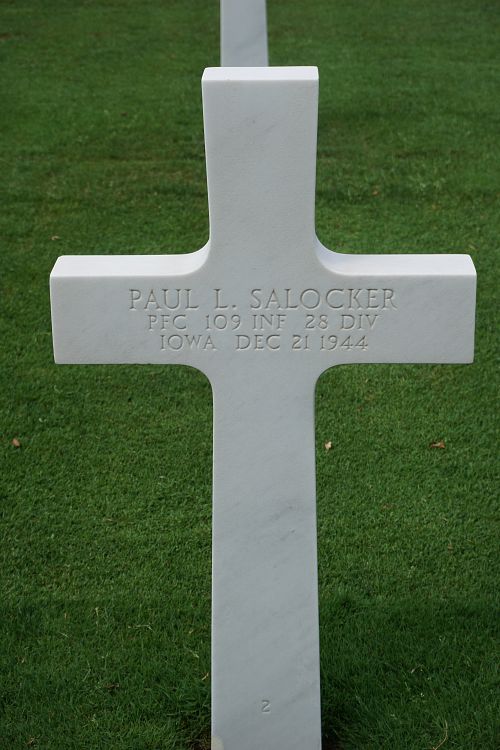 Pfc Paul L. Salocker enlisted in November 1943.Source of information: Peter Schouteten, www.abmc.gov, www.wwiimemorial.com – David G. Salocker, www.ancestry.com - Headstone and Interment Record / U.S. WWII Draft Cards Young Men / U.S. School Yearbooks Perry Iowa, www.findagrave.com
