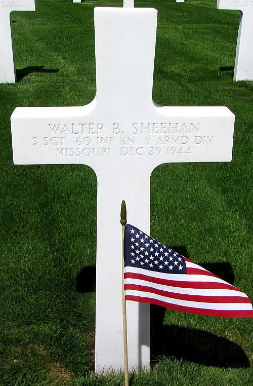S/Sgt Walter B. Sheehan graduated from Rockhurst High School and attended Rockhurst College.He was awarded the Silver Star Medal posthumously for gallantry for actions on 13 and 29 December 1944. When Sheehan's scouting patrol was fired upon by the enemy, concealed in a machine-gun nest, he defied enemy fire and annihilated the nest with hand grenades. On 29 December 1944 his outfit was suffering heavy casualties from an enemy machine-gun nest. He assaulted the gun and was wounded fatally.