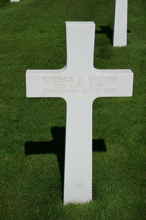 Pfc George A. Shultis attended college for one year before he joined the U.S. Army Reserve in La Crosse, Wisconsin on 27 October 1942. He was sent overseas in April, 1944.He was wounded 17 November 1944 and spent three weeks in a hospital.