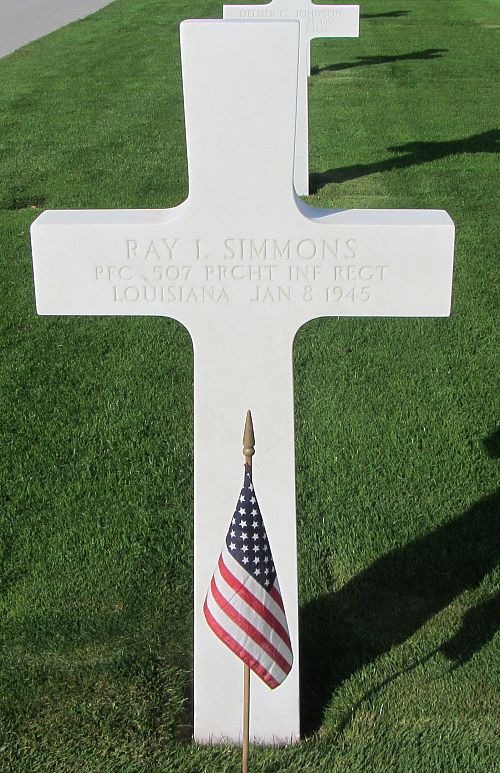 Pfc Ray I. Simmons attended Fair Park High School and was employed in the mailing room of the Times before he volunteered for the Army of the United States in Shreveport, Louisiana on 3 December 1942. He was sent overseas in September 1944.He was first buried at the Temporary American Military Cemetery in Grand-Failly, France.