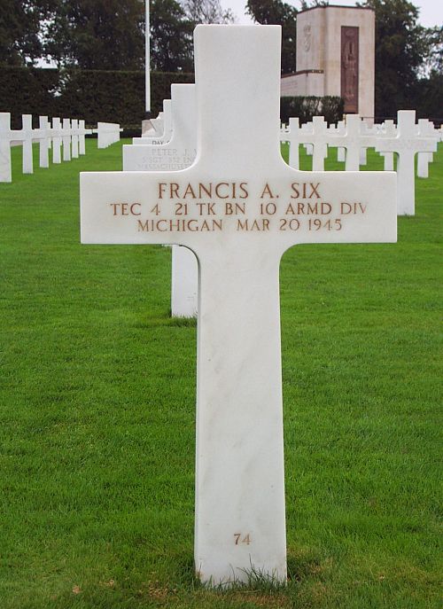 T/4 Francis A. Six attended high school for two years and worked on a farm before he enlisted in Kalamazoo, Michigan on 4 November 1942.He was awarded the Silver Star for gallantry in action at Fischbach, Germany on 20 March 1945. The citation reads in part: "When a column was counterattacked by numerous hostile bazooka teams, T/4 Six, tank driver, courageously dismounted and engaged the enemy with submachine gun fire, killing three of the enemy before falling, mortally wounded."