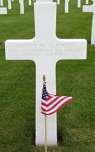 He was posthumously awarded the Silver Star. The citation reads: "Pvt Robert W. Slatton, while serving with the Army of the United States, distinguished himself by gallantry in action. On 9 January 1945, his company was participating in an assault on the enemy-held town of Bastogne, During the attack, his squad was pinned down by enemy fire from machine guns and well-entrenched riflemen. Realizing the need for immediate action, Private Slatton left his covered position and, with complete disregard for his personal safety, ran to an exposed position from which he could fire directly at the enemy. His accurate and effective fire caused several casualties among the enemy and allowed the remainder of his squad to readjust its position. Gallantly holding his position, he was mortally wounded by enemy fire. His outstanding courage, determination in the face of heavy enemy fire, and devotion to duty were an inspiration to his comrades and major contribution to the capture of Bastogne. His action were in accordance with the highest standards of military service."