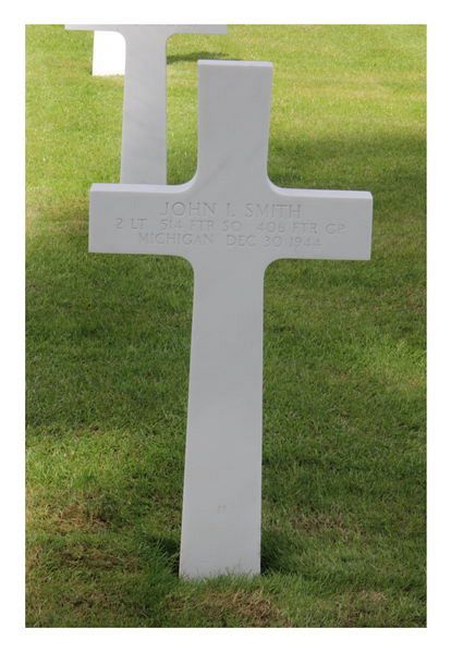 "Lt. Smith, J. I., was my wingman in an attack by red flight against a large quantity of enemy tanks and M/Ts moving in a counterattack against our troops. We were carrying Napalm bombs, and on our first deck-level attack against the enemy equipment, we received an unusually intense and accurate barrage of automatic weapon fire. Two of the flight were destroyed, and my ship badly damaged on this first pass. Lt. Smith caught fire just before he reached the deck and crashed into a patch of woods, with part of his flaming debris flying into the edge of the town of Sprimont, Belgium."