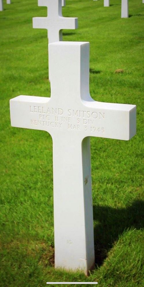 Pfc Leeland Smitson enlisted at Fort Thomas Newport on 18 March 1944. He worked on a farm before he enlisted.He was slightly wounded in action in November 1944 in France.