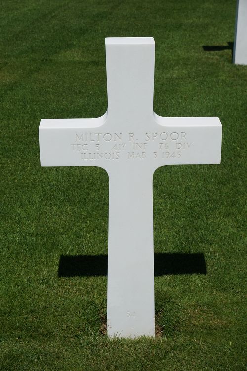T/5 Milton R. Spoor was employed by the General Spring & Bumper Co. of Chicago before he enlisted in Chicago, Illinois on 7 October 1941.Source of information: André Koch, IDPF, www.abmc.gov, www.wwiimemorial.com, www.archives.gov – WWII Enlistment Record, www.ancestry.com - 1920/1930 Census / Headstone and Interment Records