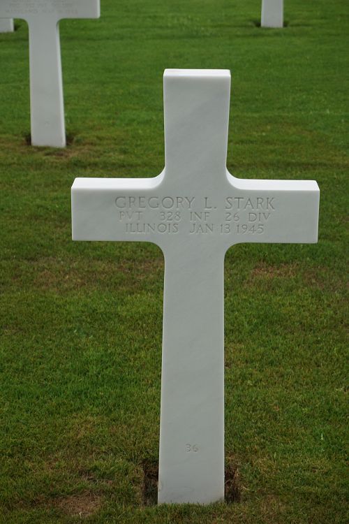 Pvt Gregory L. Stark graduated from Boys Latin School in Chicago in June 1943 before he enlisted in Chicago, Illinois. He was sent overseas in July 1944.Source of information: Peter Schouteten, www.abmc.gov, www.wwiimemorial.com - Sam E. Pennartz, www.ancestry.com - Headstone and Interment Record / U.S. WWII Draft Cards Young Men / Illes Family Tree, www.fold3.com - 26th Infantry Division, www.findagrave.com