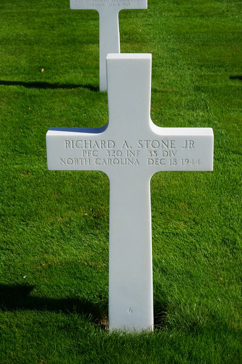 Pfc Richard A. Stone Jr. attended high school for three years and was a brakeman for the railroad before he enlisted at Camp Croft, South Carolina on 25 January 1943.Source of information: Peter Schouteten, www.abmc.gov, www.wwiimemorial.com, www.archives.gov - WWII Enlistment Record, www.ancestry.com - Headstone and Interment Record / U.S. Draft Cards Young Men / Johnson Stone Family Tree, After Action Report 35th Infantry Division, www.findagrave.com - MAJ Jimmy Cotton