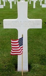 Lt Col John Stopka and some of his troopers were advancing through a pine forest along an elevated rail line. Enemy tanks were advancing along the other side. Someone called in for air support and the planes strafed too close to the friendly positions, resulting in the death of Col Stopka and thirty other soldiers near Michamps.Lt Col John P. Stopka was first buried at the Temporary American Military Cemetery of Grand Failly, France.