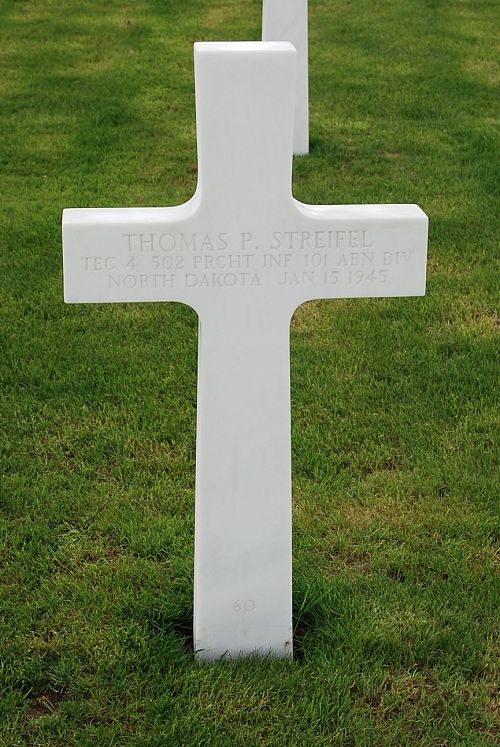 T/4 Thomas P. Streifel was first buried at the Temporary American Military Cemetery Grand Failly, France.Source of information: Peter Schouteten, www.abmc.gov, www.wwiimemorial.com, www.ancestry.com - Headstone and Interment Record, http://www.ww2-airborne.us
