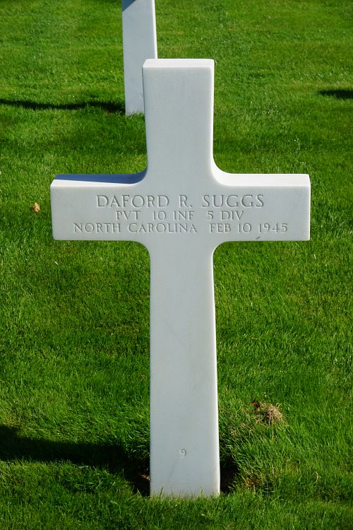 Pvt Daford R. Suggs enlisted at Fort Bragg, North Carolina on 27 July 1944. He was sent overseas in January 1945.Source of information: Leo Minne, www.abmc.gov, www.wwiimemorial.com, www.archives.gov – WWII Enlistment Record, www.ancestry.com - 1930/1940 Census / Headstone and Interment Record 1942-1949 / U.S. WWII Draft Cards Young Men / Ward Family Tree, A footsoldier for Patton / Michael C. Bilder James G. Bilder, The 5th Infantry Division in the ETO