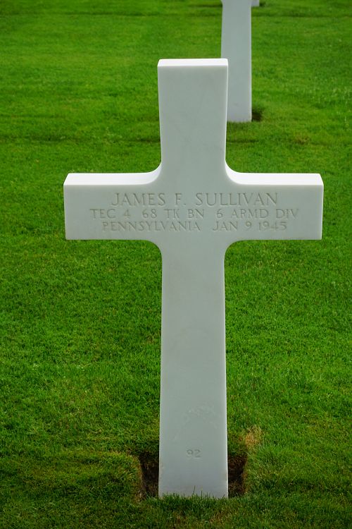 T/4 James F. Sullivan attended high school for one year and was an attendant at a filling station before he enlisted at Camp Lee, Virginia, on 30 March 1942.He died in an station hospital after he had been wounded by artillery shell fragments.