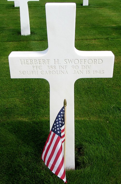 Pfc Herbert H. Swofford was a weaver before he enlisted at Camp Croft, South Carolina on 29 November 1943.He is remembered at the Cowpens Cemetery in Cowpens, Spartanburg County,