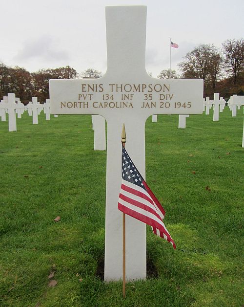 Pvt Enis Thompson was a student before he enlisted at Fort Bragg, North Carolina on 22 February 1944.Source of information: Peter Schouteten, www.abmc.gov, www.wwiimemorial.com, www.archives.gov - WWII Enlistment Record, www.ancestry.com - Headstone and Interment Record / U.S. WWII Draft Cards Young Men / 1940 Census, After Action Report 35th Infantry Division